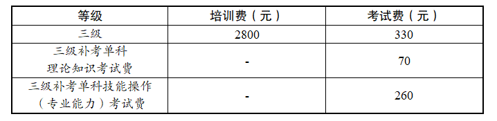 信用管理师培训和考试费用由承办单位参照往年有关标准收取,职业技能评价收费330元/人,培训收费2800元/人。考试未能通过的学员可参加下一期培训班免费听课,参加补考学员需缴纳考试费用,三级理论知识考试费70元/人,技能操作(专业能力)考试费260元/人。